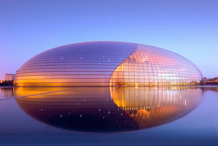 Após inúmeras falhas e congelamento na fase de concepção do teatro principal da China depois de todos, foi construído no início de 2000. Uma reminiscência de uma grande gota de água, ou um disco voador pousou na capital chinesa, um edifício incrível imediatamente abraçada pela maioria dos residentes locais e visitantes para a China. Teatro estrutura de cúpula é 212 metros de comprimento e cerca de 47 metros de altura, feito inteiramente de metal e vidro. O edifício está localizado na superfície de um lago artificial, e entrando nele são túneis subaquáticos com um teto transparente.