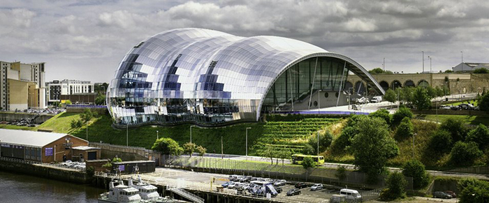 Centro de Educação Musical "Sage Gateshead", localizado na cidade de mesmo nome, no nordeste da Inglaterra, foi construído em 2004 pelo arquitecto britânico legendário, Norman Foster, Baron. A estrutura deste construções super-modernos é formado por dois componentes principais - o vidro curvado e aço inoxidável. "Sage Gateshead" é composta principalmente por três salas: uma grande (1.700 lugares), para grandes concertos, pequenas (400 lugares), para eventos de menor escala, e um hall. O resto do complexo ocupado por bares, cafés e biblioteca de mídia.